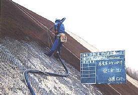 下地材にラス金網を張付・種子・肥料・植生基盤材・安定剤を混合しモルタル吹付機を用いて吹付厚3〜10cmで吹付ける工法です。
